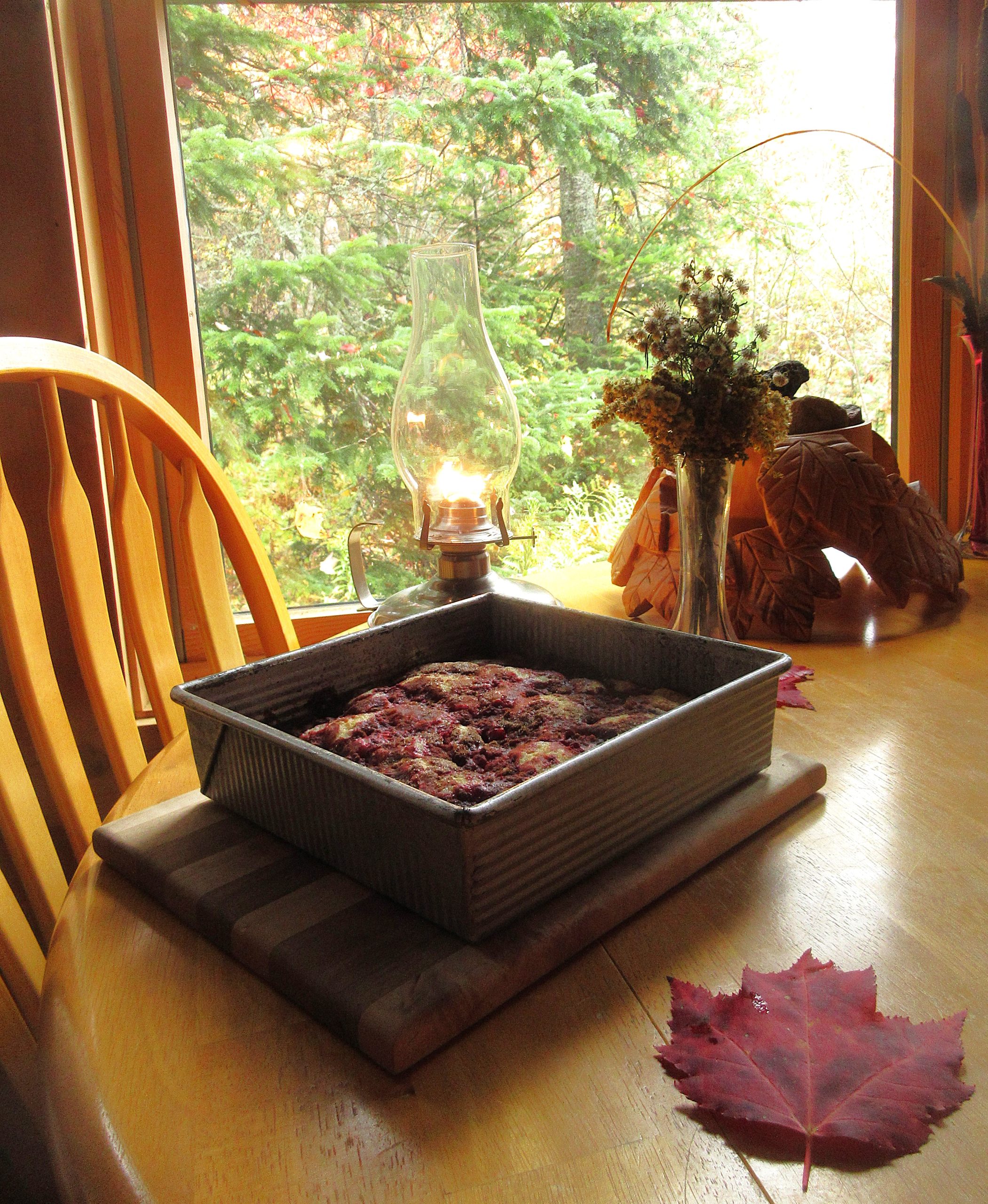 In the mood for a treat, I made a cake with raspberries that came from a patch along the banks of the Piscataquis River. Being off the grid, I used an old-fashioned hand-crank mixer for the batter and baked it in my propane-fueled oven.