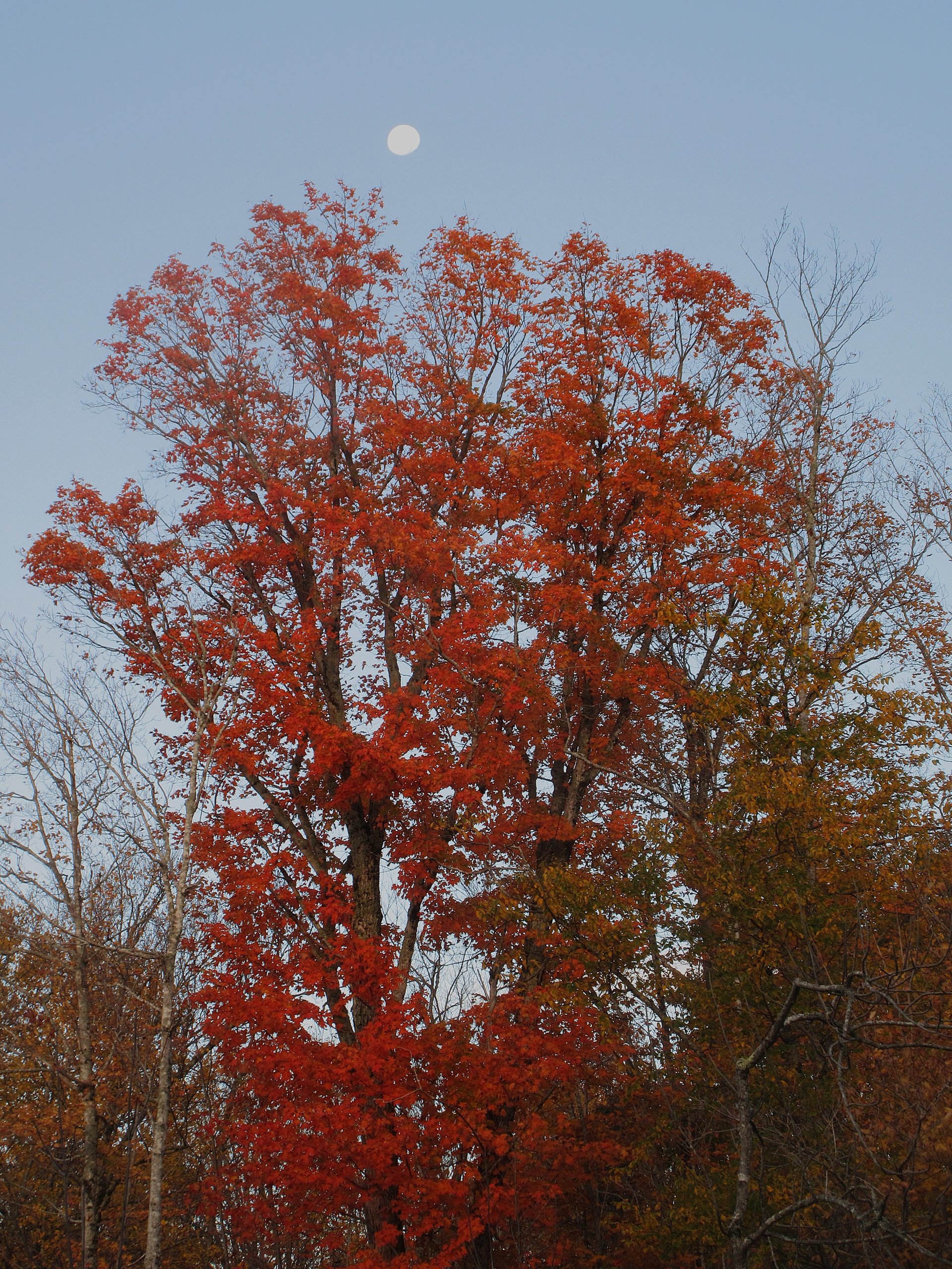 The next morning, I got up before sunrise to drive back to the visitor center in time for its eight o’clock opening. As a reward for my efforts, I caught a glimpse of the waning moon above a fiery maple.